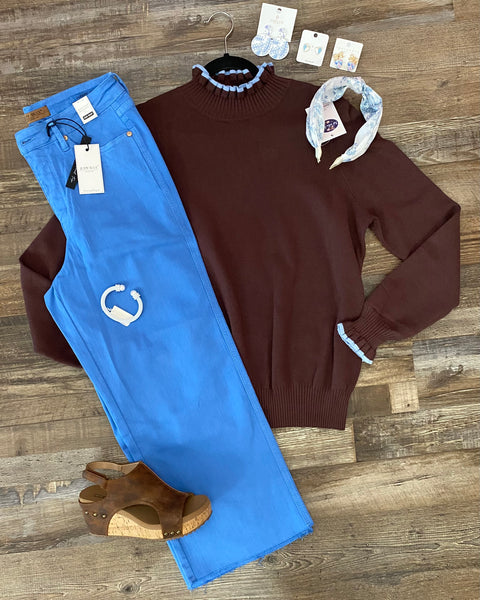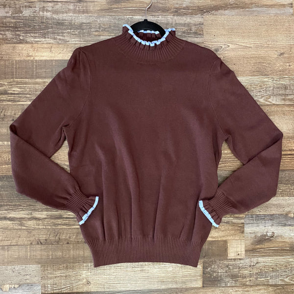 Experience refined comfort with this soft brown sweater, elegantly accented by a delicate ruffled blue trim. Its subtle contrast adds a touch of sophistication to your wardrobe, perfect for layering or wearing on its own during cooler days. The gentle fabric promises warmth while maintaining a polished look, making it an ideal choice for both casual and upscale occasions.