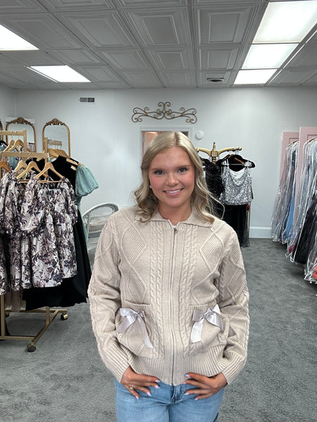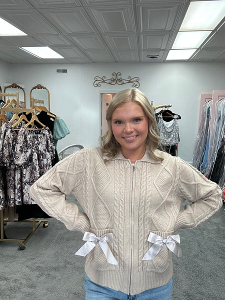 Wrap yourself in luxury with this irresistibly soft cardigan, complete with charming satin bows adorning each pocket. The plush fabric feels like a gentle hug, while the delicate bow details add a touch of whimsy and sophistication. Perfect for layering over your favorite outfits, this piece effortlessly transitions from cozy weekends to polished occasions. A playful wardrobe essential that brings both comfort and style.