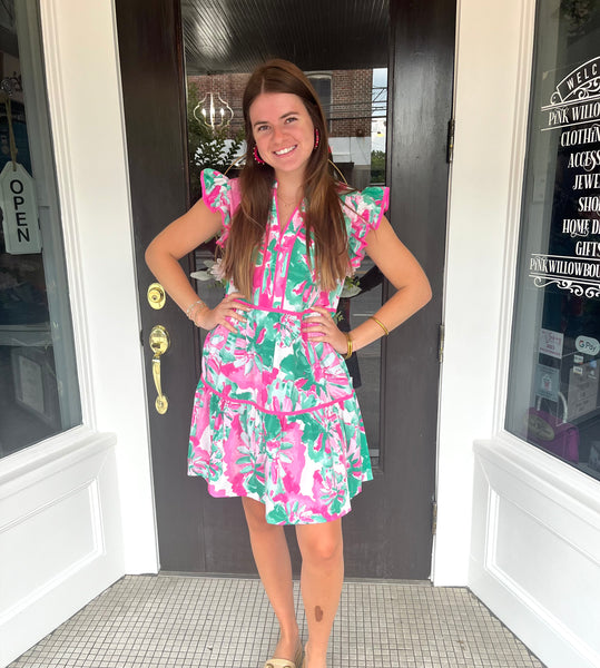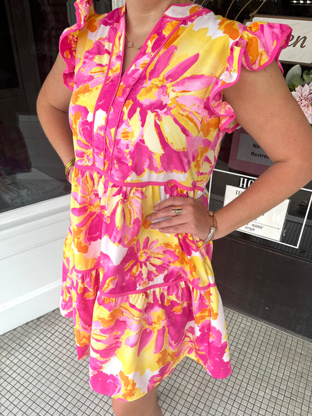Add a touch of whimsy to your wardrobe with Haleigh! This bright floral dress features ruffle short sleeves, contrast piping, and side pockets for a functional yet stylish look. Perfect for any occasion, this tiered short dress is sure to turn heads (and hold all your essentials)!