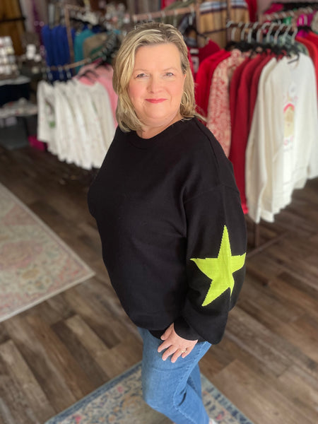 Stay warm and stylish wearing Starz, the plus size black sweater with two contrasting stars, one pink and one lime green. And the balloon sleeves? Match made in heaven. Keep cozy with this quirky but adorable look!