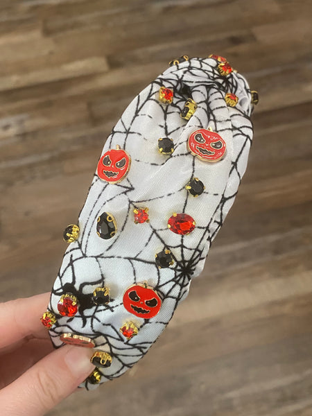 Elevate your Halloween style with this elegant black and white webbed headband, adorned with delicately crafted Halloween-themed jewels. The subtle knot detail adds a refined touch, making it the perfect accessory to artfully complement your festive look with a sophisticated flair.
